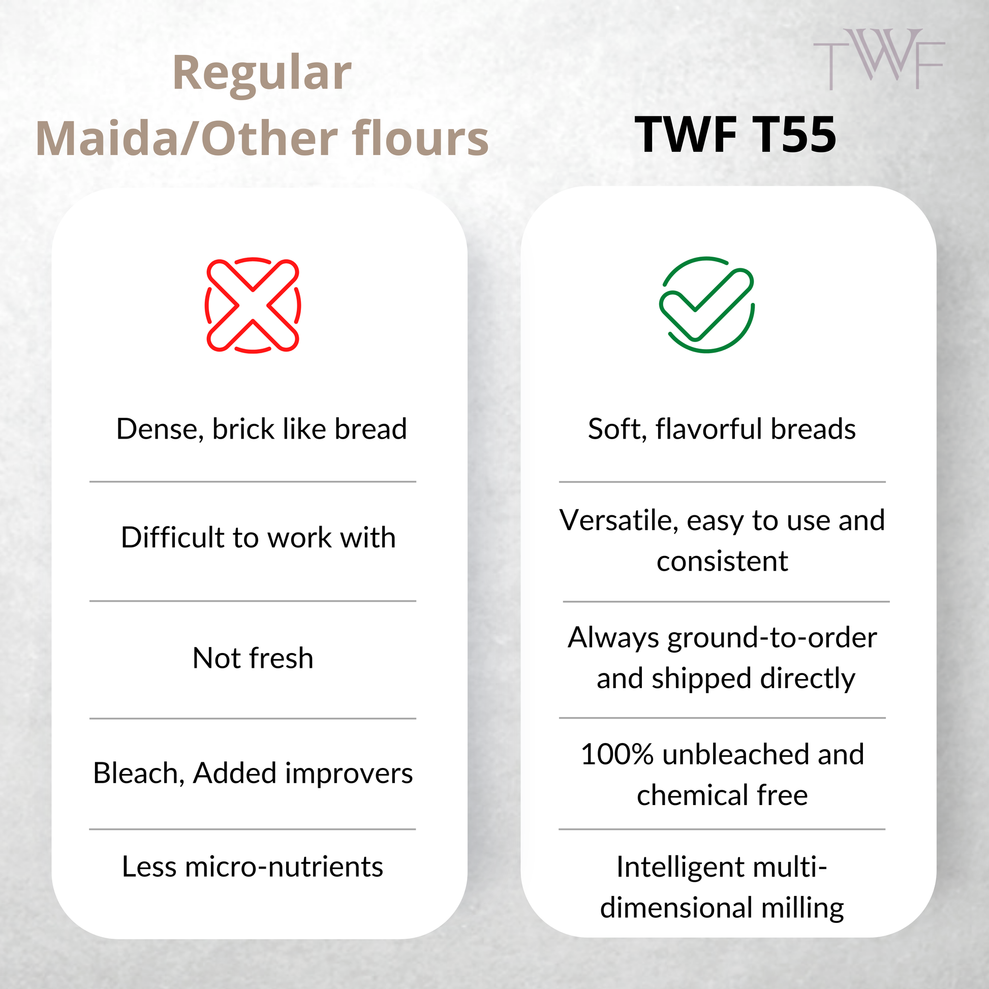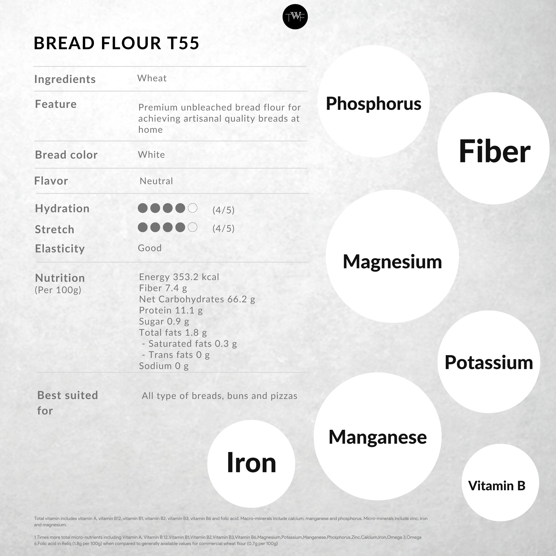 Elevate your bread-making with TWF T55 Bread Flour, crafted to deliver optimum dough strength, extensibility, and consistency. Designed for all bread types, it supports excellent gluten development, balanced elasticity, and uniform crumb structure. The neutral flavor allows the natural character of your bread to stand out.