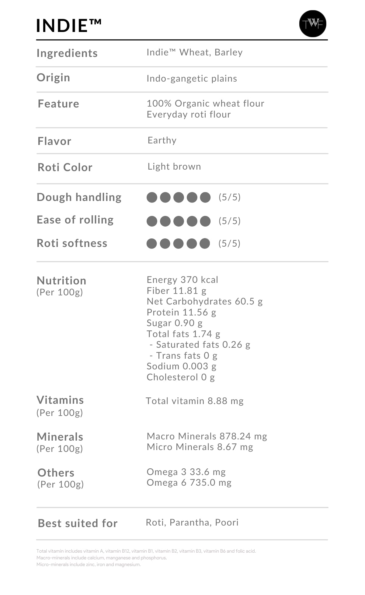 Indie flour is made from an indigenous wheat from the Indo-Gangetic plains. This Indian wheat yields itself perfectly for flat breads such as rotis and paranthas.