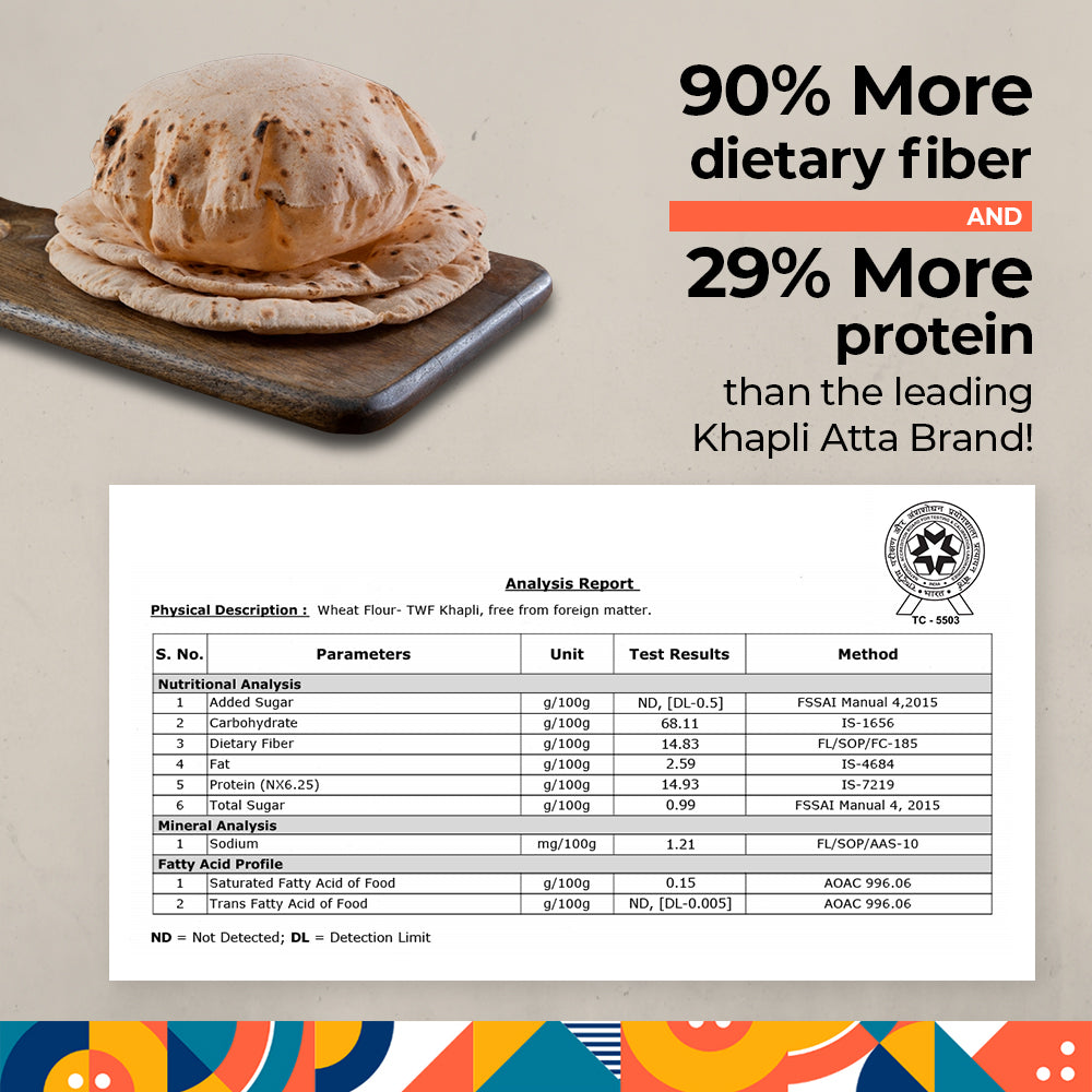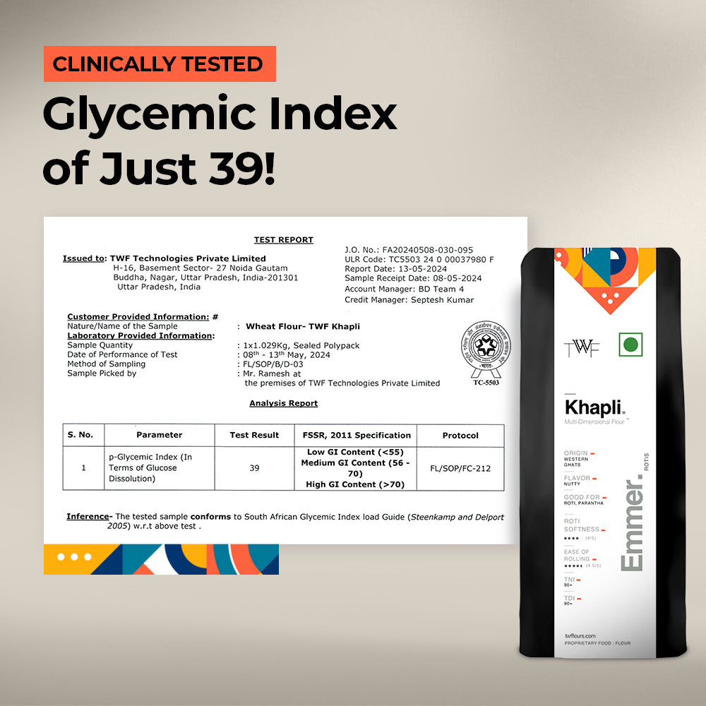 Low Glycemic Load & Index: With a GL of just 20.8 and a GI of 39, TWF's Khapli Atta supports balanced blood sugar levels and sustained energy throughout the day, making it ideal for a diabetic-friendly diet.