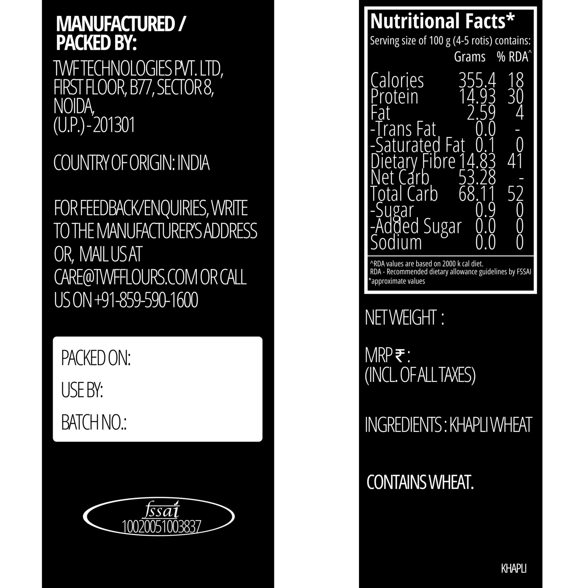 - 14.83g Fiber per 100g for Digestive Health: TWF Khapli Atta is rich in fiber, supporting healthy digestion.