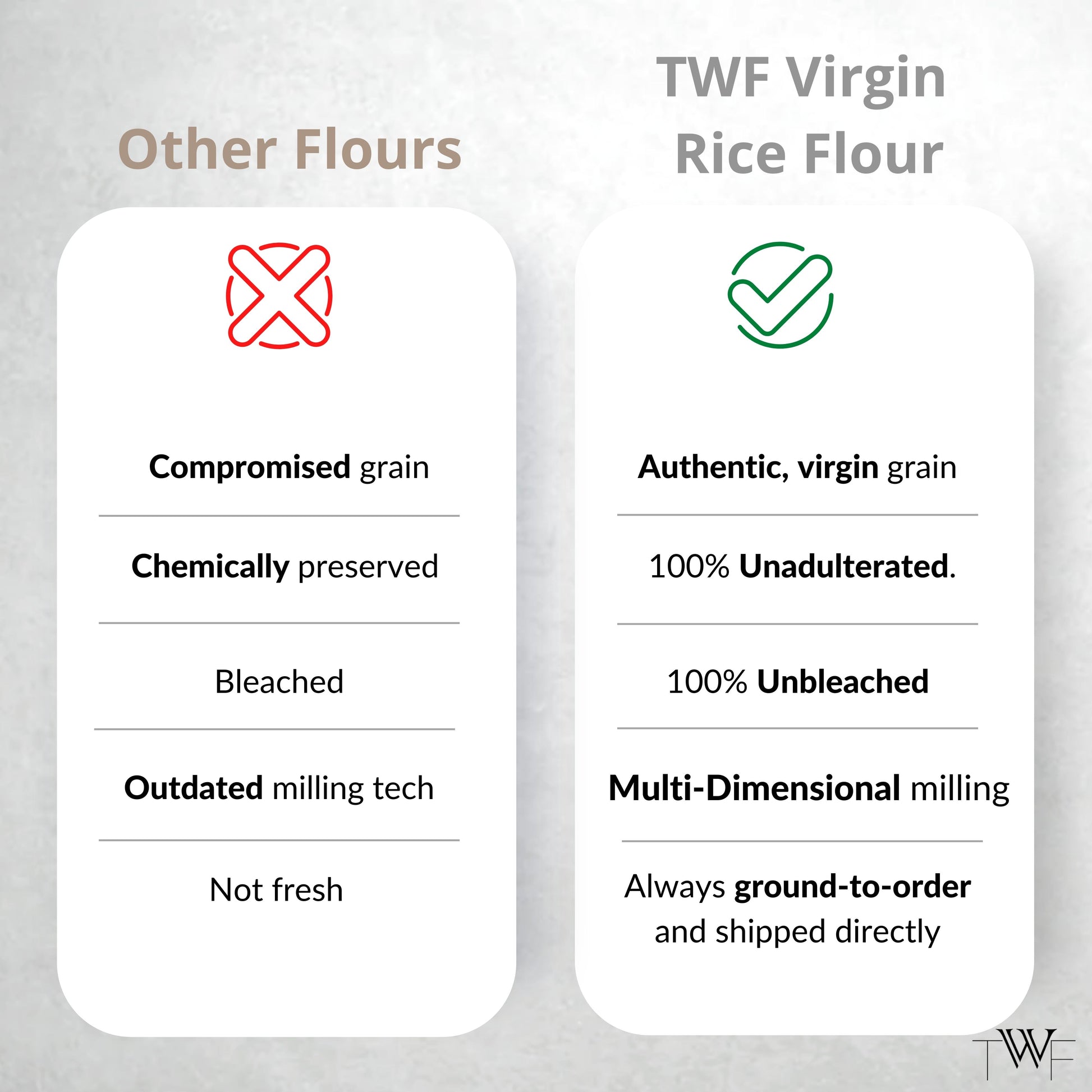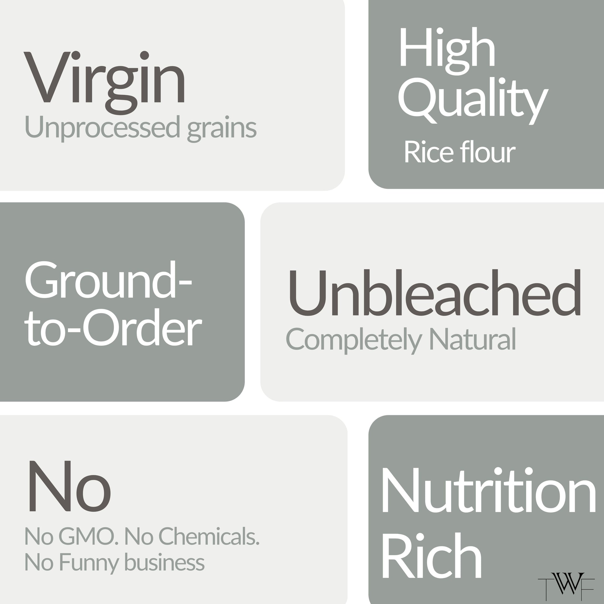 100% Virgin Rice Flour: Made from high-quality 100% virgin grains to ensure maximum nutrition and trueness to nature
